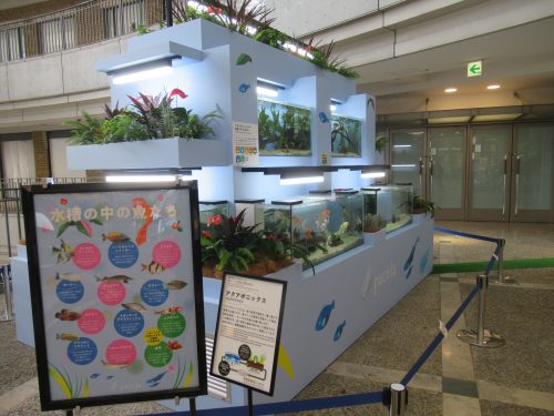 Before even entering the Motomachi Aquarium, visitors to Pacela will already be able to see marine animals in the form of pictures and an aquaponics exhibit on the mall’s second floor. What is aquaponics, you ask? I didn’t know either, but the bilingual informational plaque informs shoppers that it is an agricultural system in which fish tanks and gardens coexist to each other’s benefit. Fish waste and leftover fish food and transferred to the soil of a garden, helping vegetables and other plants grow. The water used in the garden runs into a pump filter that cleans the water and directs it back into the fish tanks. Aquaponics saves farmers money and benefits the environment by minimizing resources required for agriculture.