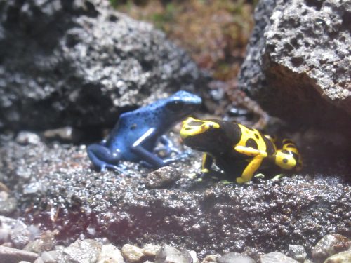 The curtain at the end of the Welcome Chamber led to the second area, modeled after a lush, green forest. Here, there were not only fish, but plenty of reptiles, amphibians, and even mammals awaiting visitors. I loved so many of the animals here, but a couple that stood out to me were these poison arrow frogs that reminded me of toys I used to play with when I was little. The blue one on the left evoked memories of some juice drink I used to enjoy, and the one on the right had a distinct pattern loosely resembling a week-old, expired tamagoyaki (Japanese rolled omelet).
