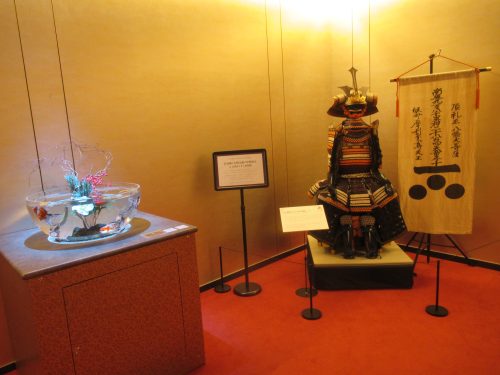 Eventually I came upon the penultimate room, called “Zipangu,” which had a traditional Japanese motif. There were goldfish bowls, Hiroshima Castle paraphernalia, and even a suit of armor worn by Mori Motonari, the twelfth daimyo (大名 – feudal lord) of the Mori clan. The café—which has tables for customers to stand while eating—is also located here. I placed my order at the counter and explored the room while they made my food.