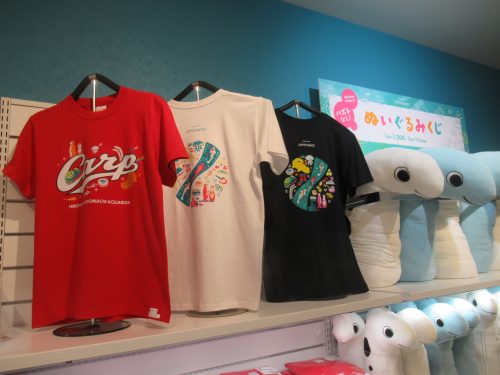 Before talking about the final room, let me first mention the gift shop back outside in the lobby. Most of the goods for sale are generic aquarium-esque souvenirs that don’t have the name “Motomachi” or even “Hiroshima” on them. However, there are three T-shirts that mention the name of this aquarium, and the red one is actually a collaboration with the Hiroshima Toyo Carp baseball team.