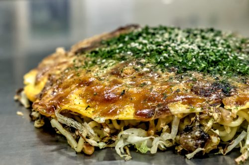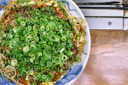 Close up of “The Hiroshima Special” from Sarashina. Sarashina’s okonomiyaki is unique for using fish powder and dried seaweed to season their okonomiyaki. (Joy Photos / Michael Farrell)