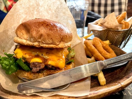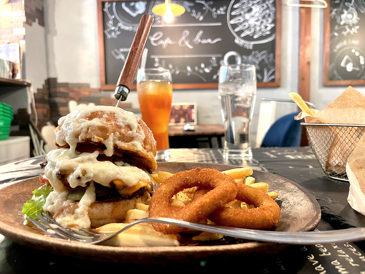 Burger Cafe minomino is a burger shop near Hondori that specializes in customizable smash burgers paired with fries and onion rings.