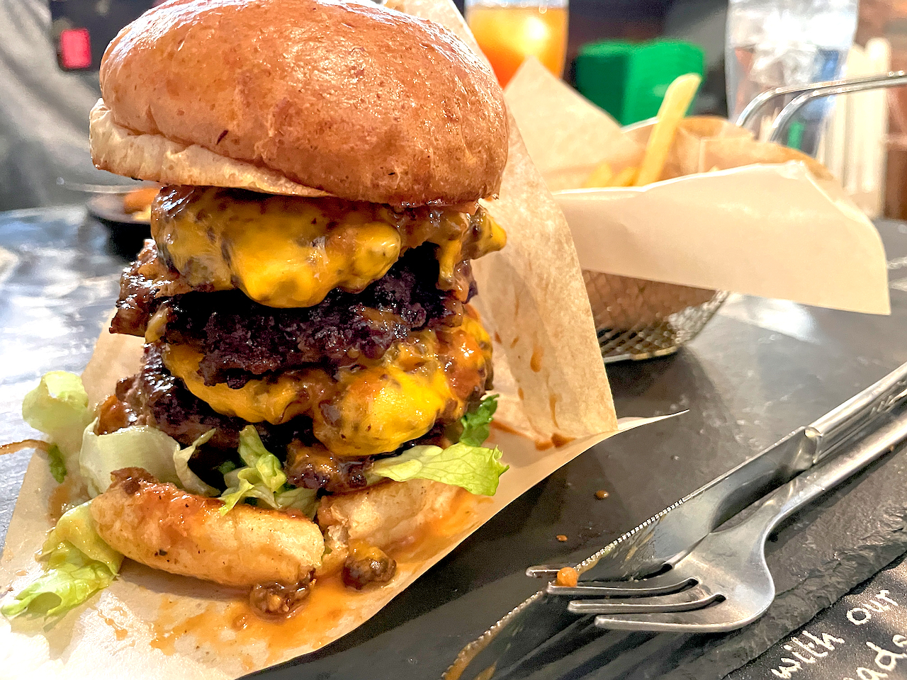 So if you’re really hungry and want to build an epic burger, you could expand the tower cheese burger to five patties, top it with jalapeños, avocado, and a fried egg and then drown it from bun to bottom in cheese sauce.
