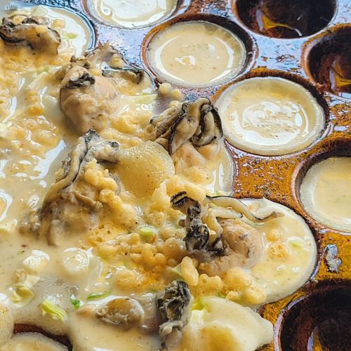 At “Okita Suisan,” diners can enjoy a wide variety of oyster dishes in a street food stall-like atmosphere, something only possible at an establishment directly operated by an oyster farmer. Particularly popular is the oyster-filled pancake, where plump oysters are baked in a round shape with batter. They also offer classic oyster dishes such as fried oysters and steamed oysters.