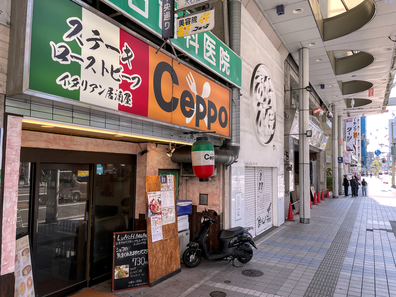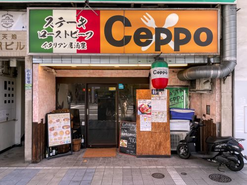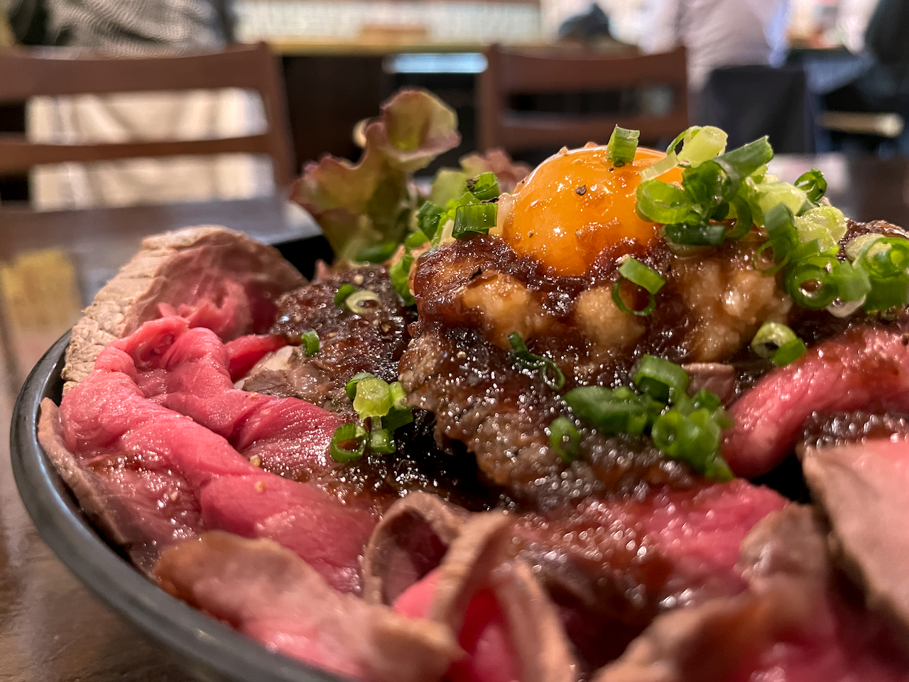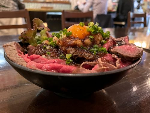 Pasta Ceppo in downtown Hiroshima has a uniquely Japanese take on Western food—mix it all together. Pasta Ceppo specializes in beef steaks, English roast beef and Italian pasta and pizza. And their menu sometimes crosses the boundaries between culinary worlds. A great example is the ¥980 “Roast Beef Don” set sold only at lunchtime. Despite the restaurant styling itself as Italian, this dish, found on the lunch menu next to Vongole Blanco and Peperoncino, is really a fusion of English and Japanese cuisine. This dish mixes the Japanese concept of a donburi, a bowl of rice topped with meat and vegetables, with English style roast beef. The house made, red-wine and onion sauce poured over the dish might be Italian in inspiration, but what is definitely clear is that this is a very Japanese dish topped with a very English meat—which happens to be brilliantly red, extremely tender and topped with a rich egg yolk. It also comes with a chunky tomato soup and a simple salad of fresh mizuna greens and lettuce topped with splinters of carrot, onion and purple daikon. At lunch time you can even get a free hot coffee. All of that for just 980 yen— a real bargain in Japan where roast beef is considered a refined, foreign, luxury food.
