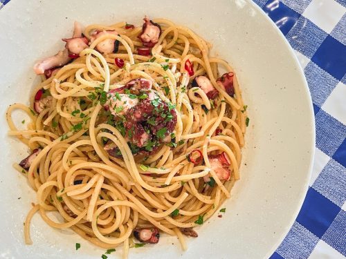 A look at the menu might initially make a Westerner suspicious of whether the restaurant is actually Greek. The main dishes—spaghetti and risotto—aren’t exactly traditional Greek pasta fare. However, in keeping with modern trends in Greek cooking, the original Italian dishes are reinterpreted through the lens of Greek flavors, creating a fusion that looks and sounds Italian but tastes Greek.