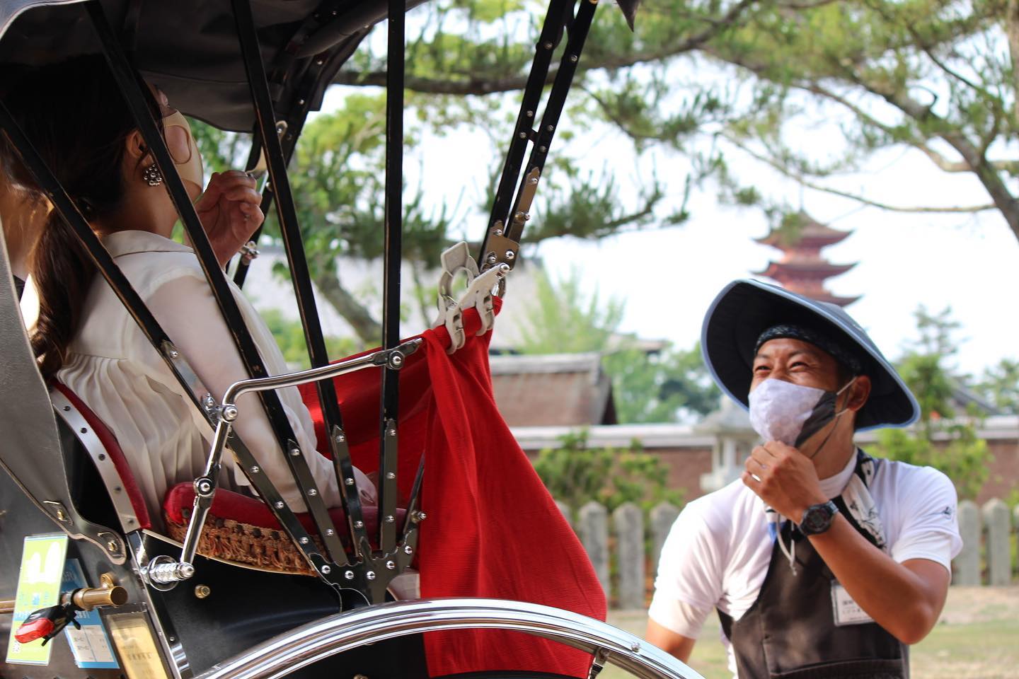 EBISUYA Miyajima offers a service that allows visitors to tour Miyajima on a rickshaw (a traditional Japanese transportation method). The Ebisuya rickshaw not only takes you to your destination but also provides you with a tour guide who can tell you more about Miyajima and its attractions. There are four different courses to choose from, and each course has a maximum capacity of two people per rickshaw (multiple rickshaws will be used to guide three or more people).