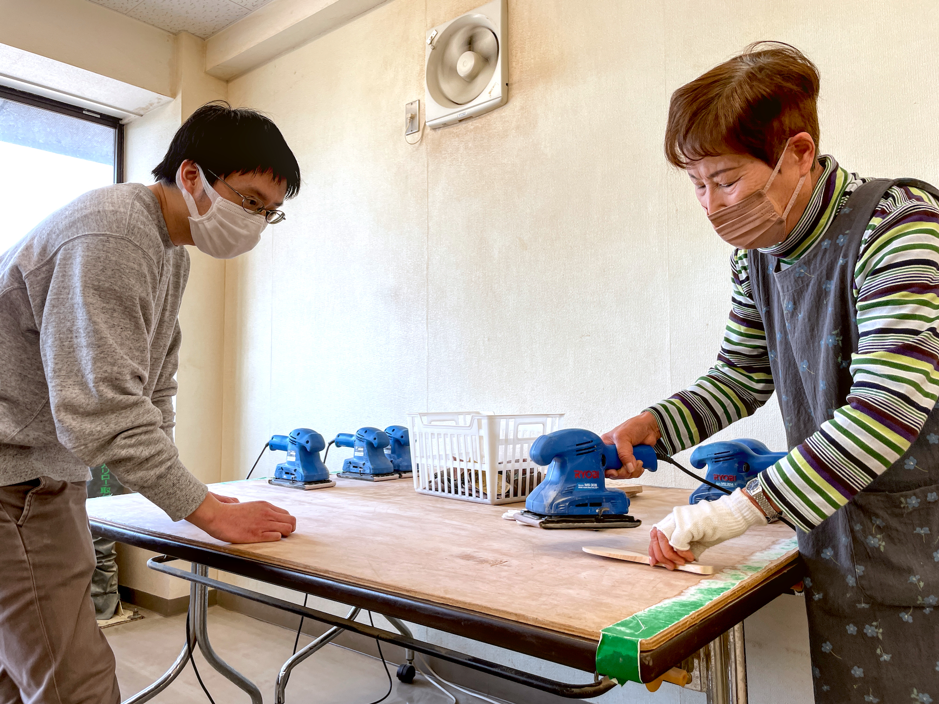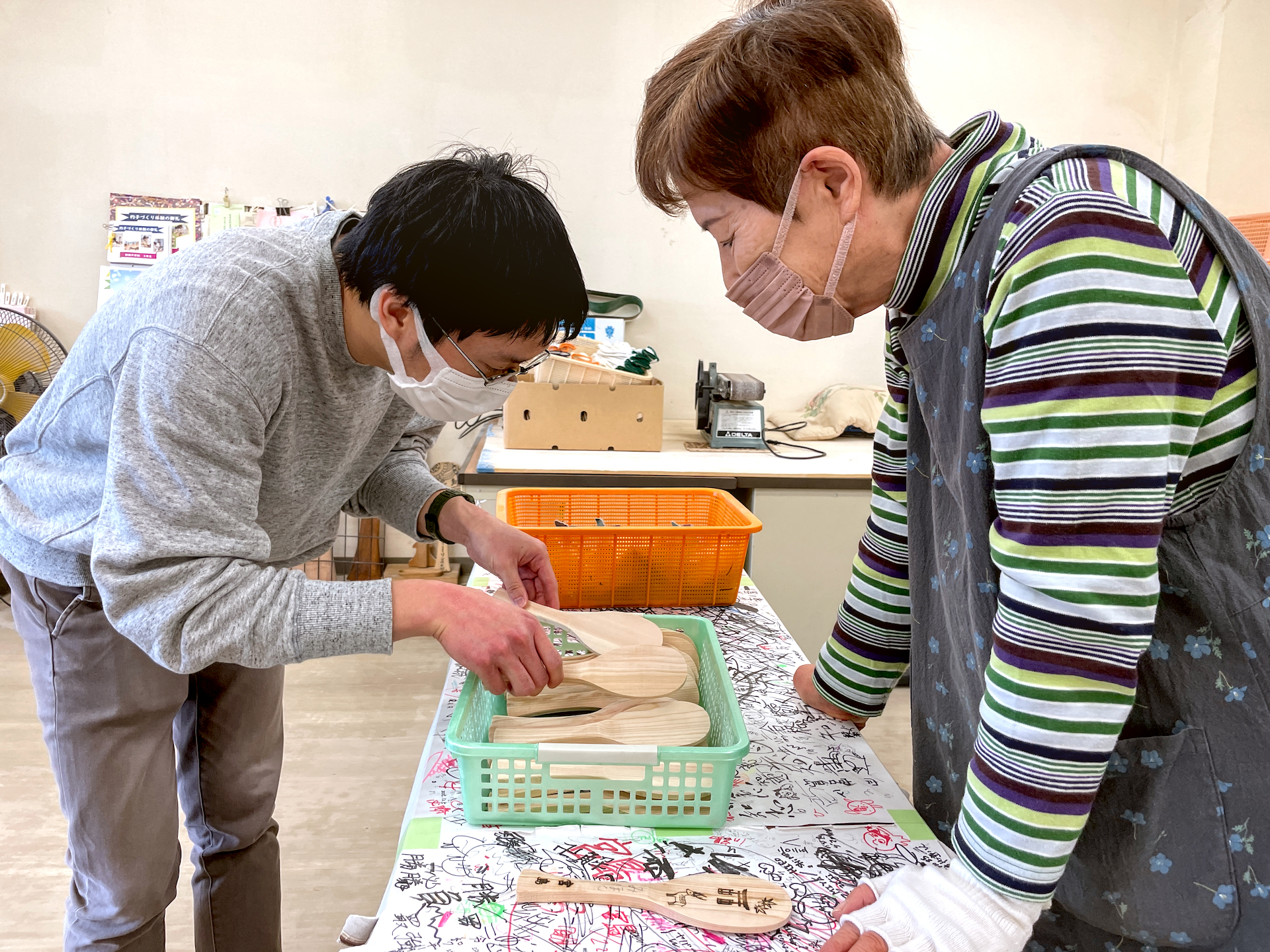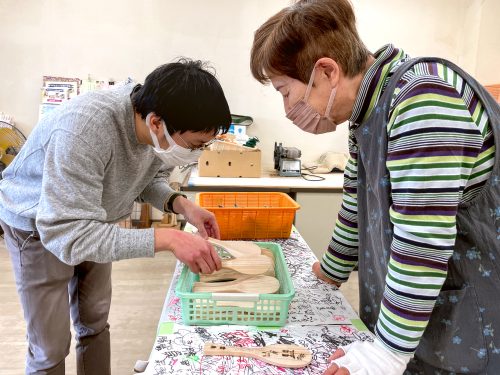 Next follows a sanding lesson: how to use a belt sander for the flat parts and sandpaper on the edges. Once the scoop is smooth, you are shown how to use a branding iron to personalize the scoop. Designs include maple leaves, deer, torii gates and the island’s name in Japanese characters.