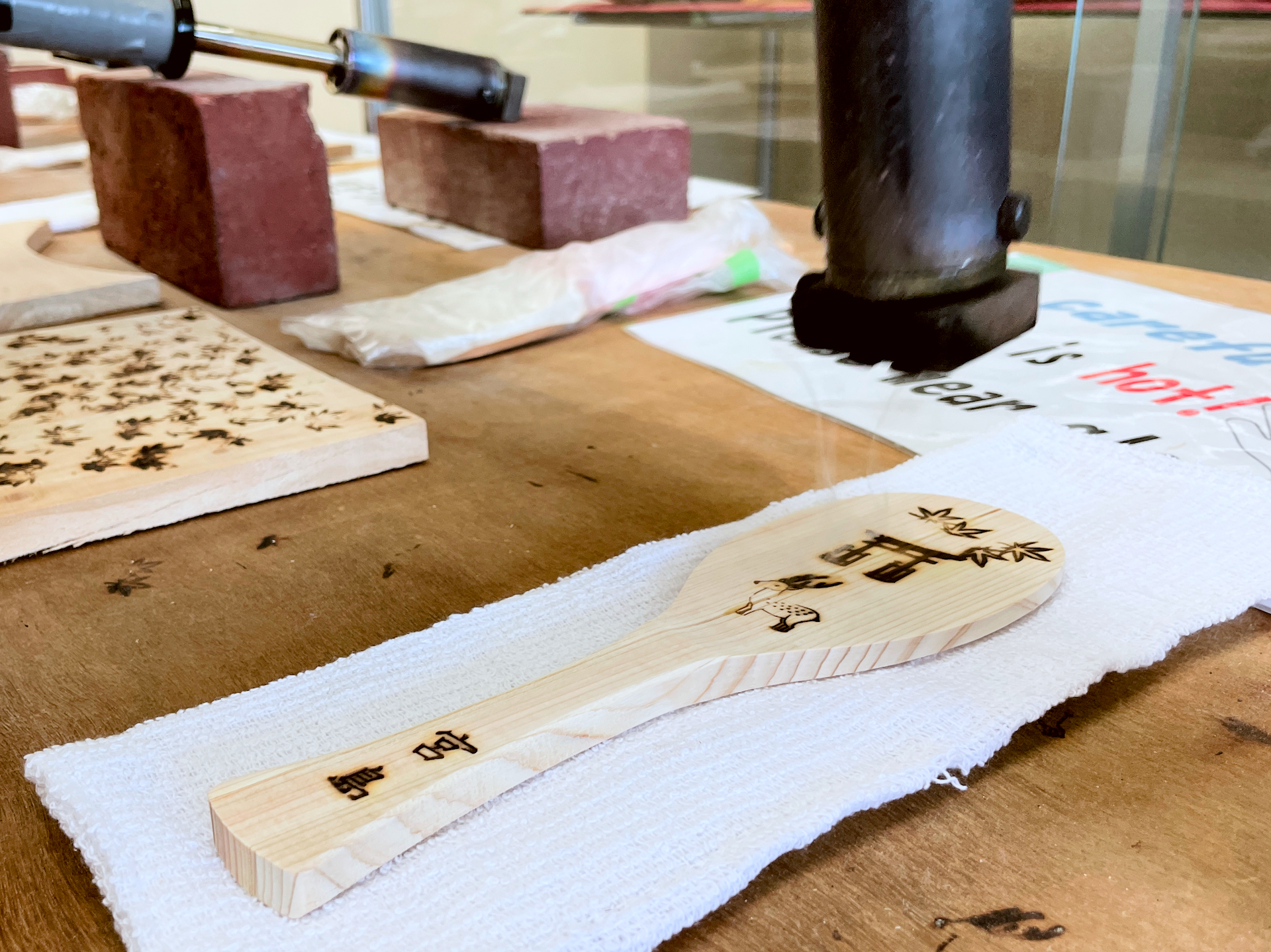 Decorating a Miyajima shakushi with hot irons makes a permanent mark. And using the irons is not as easy as it looks. If you press too lightly or off-center, the pattern will not transfer evenly. If you push too hard and wait too long, the iron will etch deep, dark marks that look more like burns and less like designs. Fortunately, the skill is easy to pick up with a little practice. And visitors can practice as much as they want on scrap wood before touching the scoop they take home.