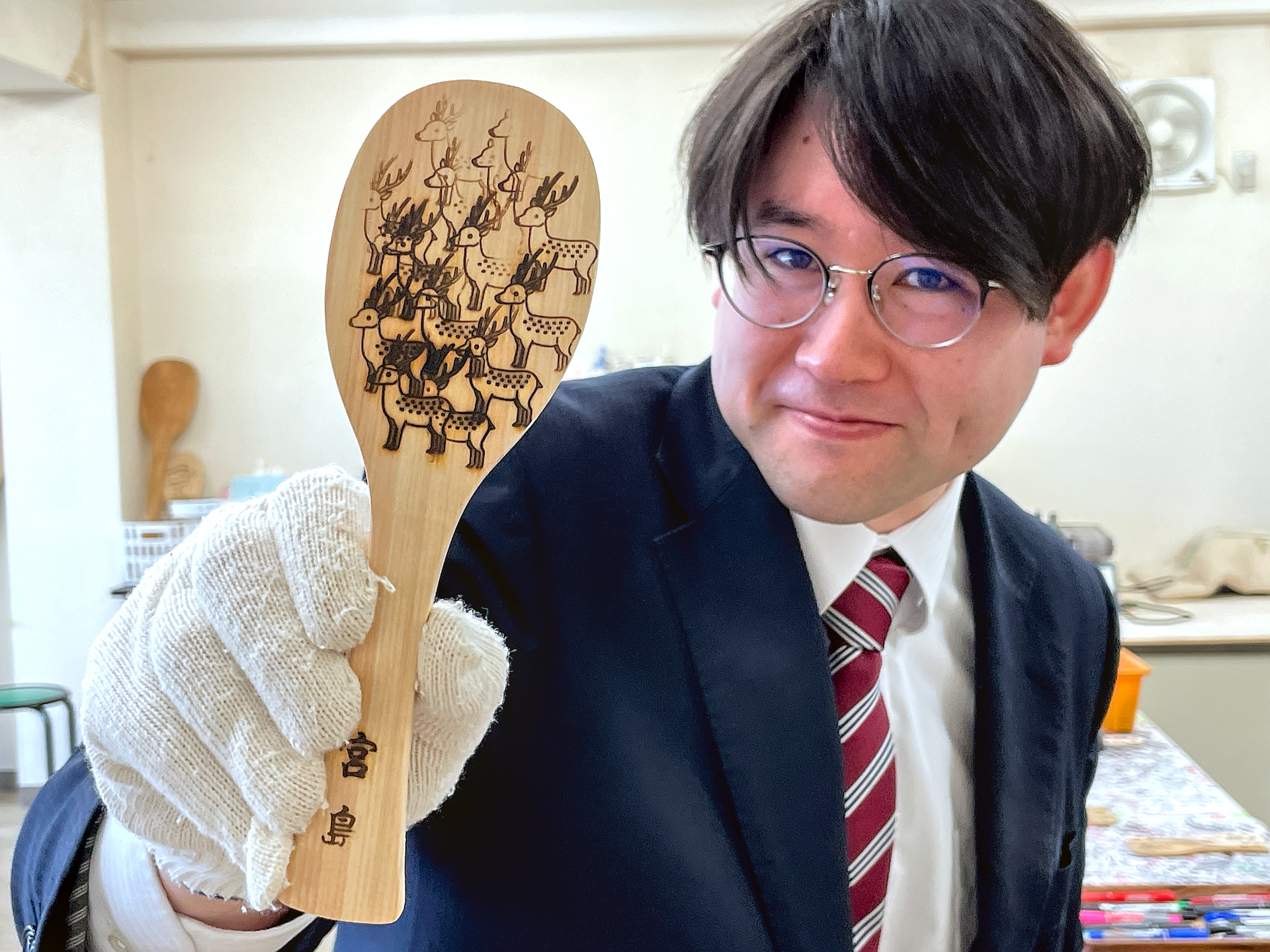Miyajima Traditional Crafts Center gives you the opportunity to make your own Miyajima shakushi for ¥660. In the third-floor workshop, rows of hot, electric irons rest on red bricks, ready to burn designs. You are guided every step of the way towards crafting your own souvenir. Everyone gets a pair of gloves to keep hands safe from splinters and burns. Once hands are protected, you are walked through the process of turning a rough-cut wooden scoop into a decorative but usable kitchen tool.