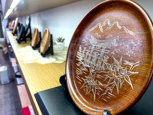 While exploring Omotesando Shopping Street, it’s common to see wooden plates in souvenir shops. They often depict intricate carvings of island scenes like the Great Otori. One style has a 3D effect so the image pops out of the wood. Another style is more understated with scenes cut onto the wood as if by calligraphy brush strokes and then filled with color. These techniques are part of Miyajima-bori woodcarving, the island’s more than 200-year-old wood carving tradition.