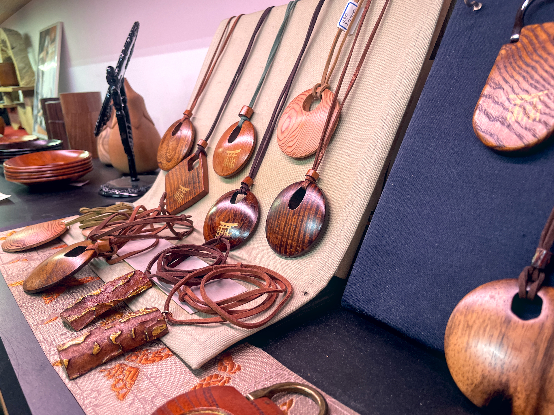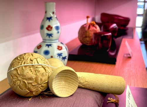 It is a collection of three distinct techniques: shakushi (rice scoop) carving; rokuro zaiku, a woodturning technique; and Miyajima bori, a style of relief woodcarving that makes images pop out of the wood.