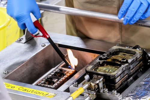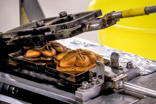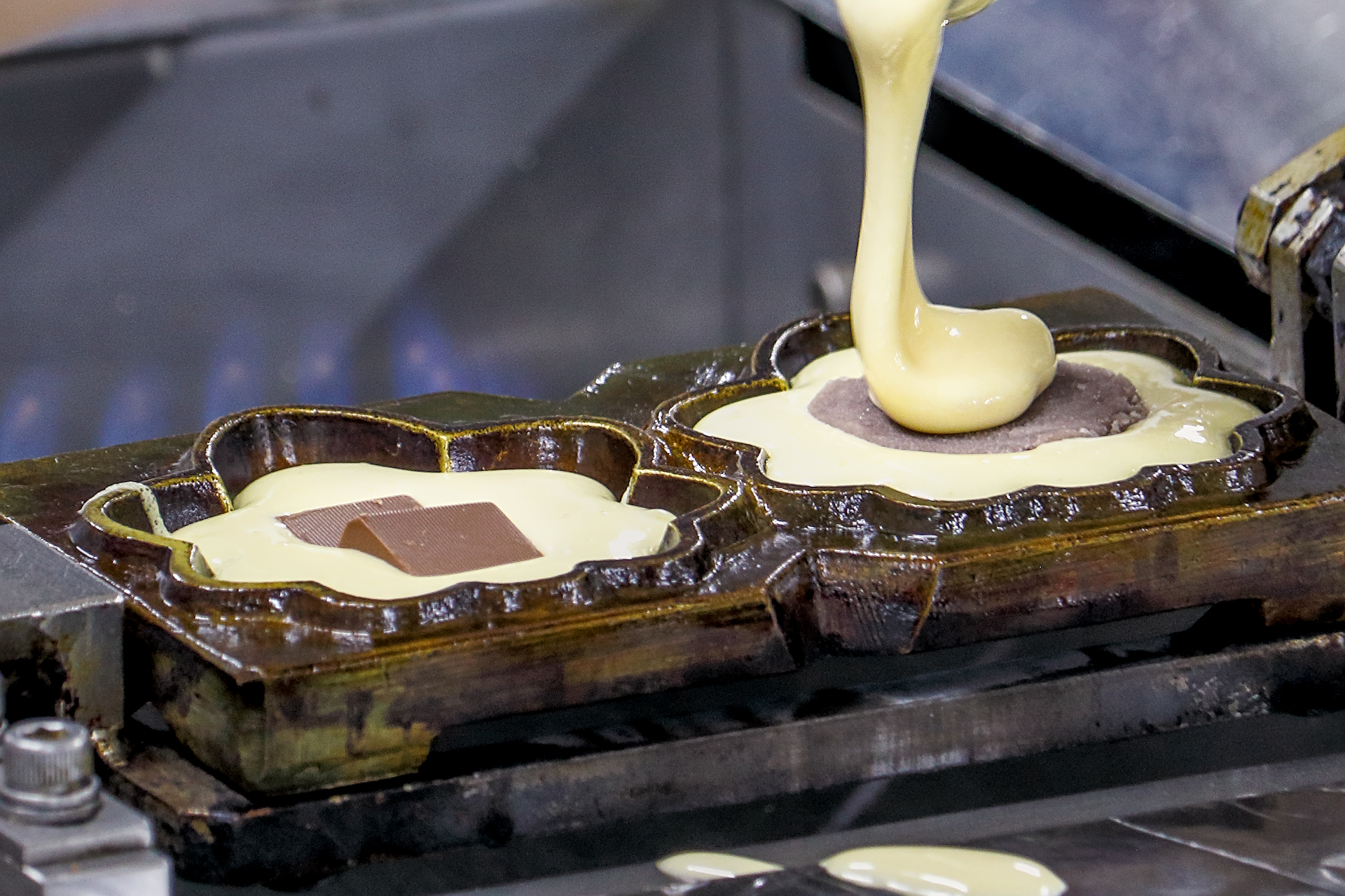 The instructor walks guests through how to use a manju yakigata, a twistable, cast-iron manju mold used to cook the pastry over a 170℃ (338℉) gas flame. Next to the yakigata is a ladle and bowl of batter made from a meringue mixed with wheat flour, egg, sugar, rice syrup, and a little water. A clock is under the yakigata handle to keep track of the time as you heat it up and cook. The iron mold has space to make two manju, each with a different filling: a bite-sized chocolate bar and a puck-shaped piece of Yamadaya’s homemade anko-paste.